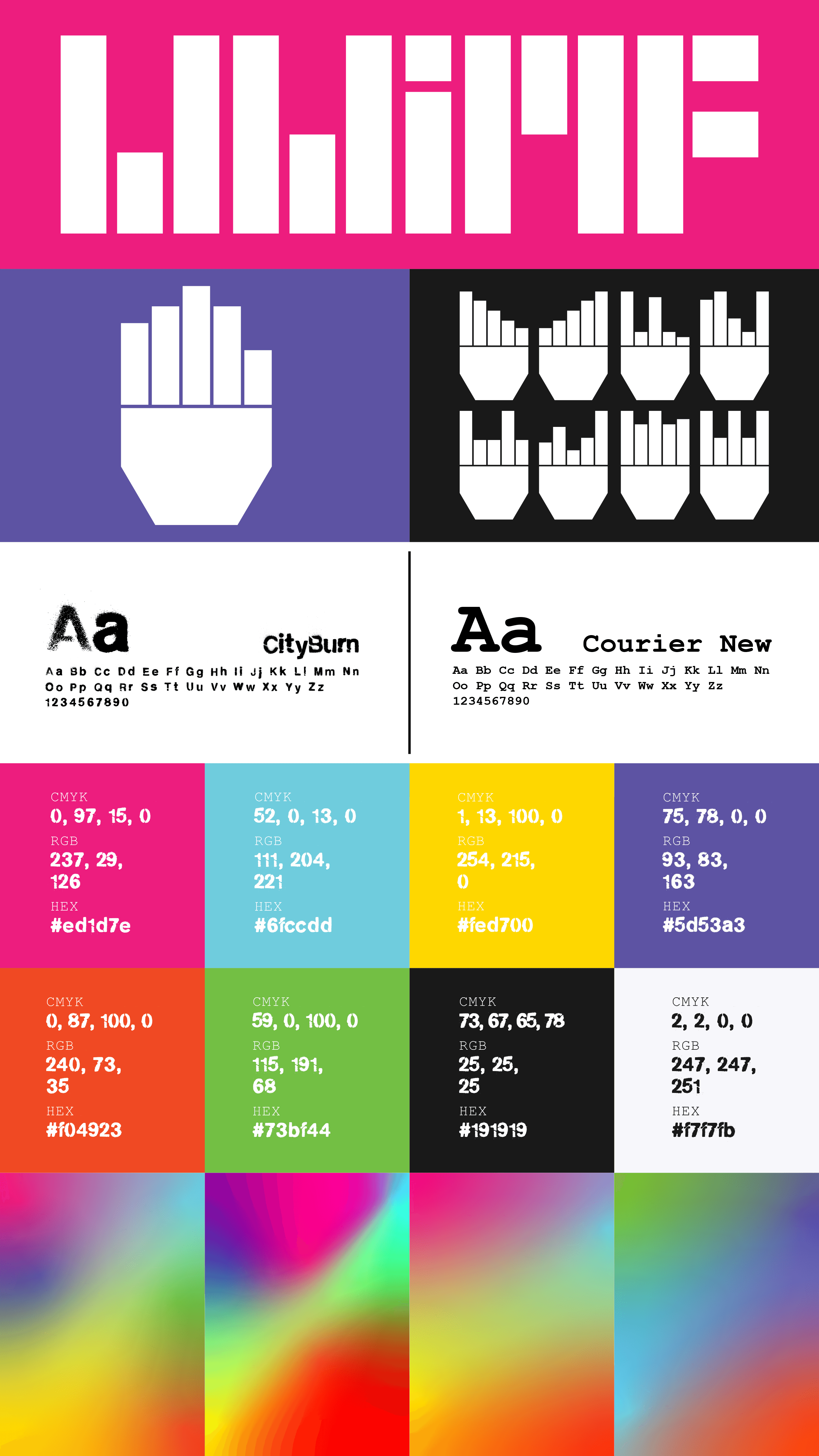 WWIMF’s typography blends Cityburn Regular with Courier New, creating a balance between experimental energy and technical precision. Cityburn adds a bold, contemporary edge, while Courier New brings a structured, analog feel connecting the identity to both music production and digital interaction. The color system is bold, abstract, and high-energy, using unconventional combinations to echo the festival’s immersive and boundary-pushing character. The overall visual system is designed to be flexible, expressive, and suitable across both digital and physical environments.
